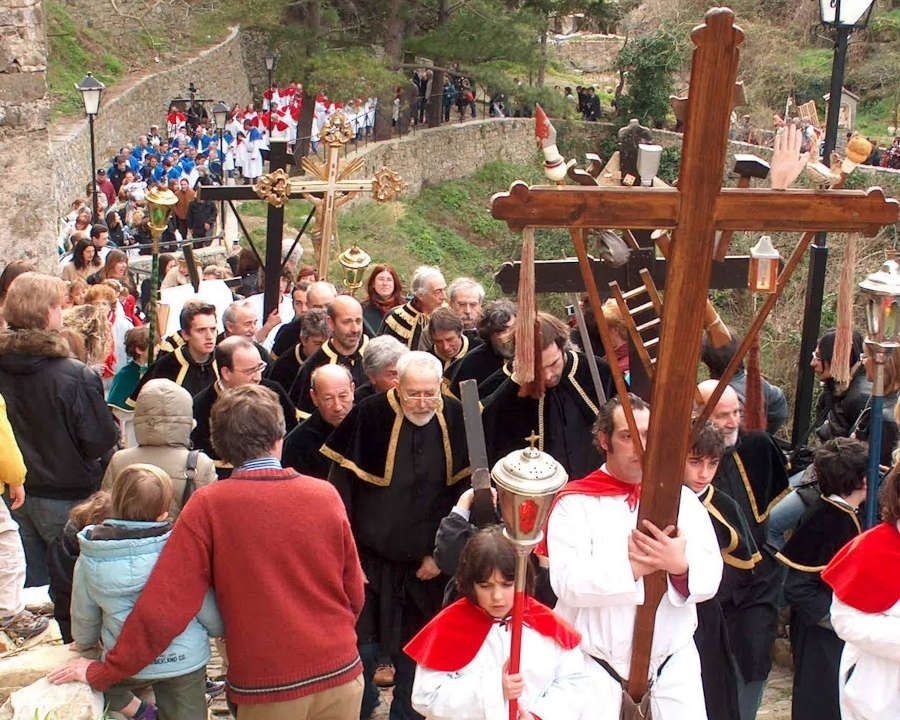 I cori millenari: Le quattro confraternite del paese si sfidano in canti polifonici a cappella che risuonano per le vie medievali. Il suono dei corni di corteccia (trombe naturali ricavate dagli alberi) annuncia l’inizio dei riti, creando un’atmosfera quasi ipnotica e fuori dal tempo.